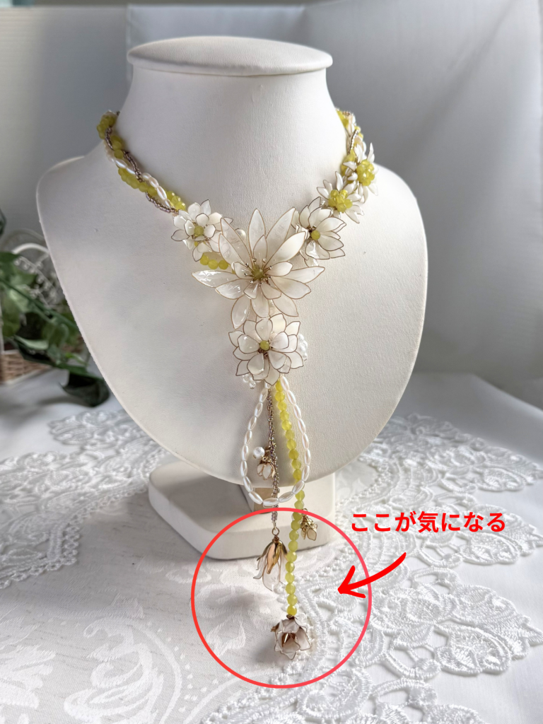 こだわって長く垂らしたモチーフが下についてしまうこと…。